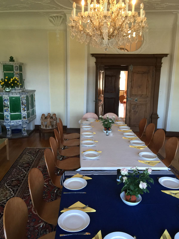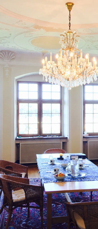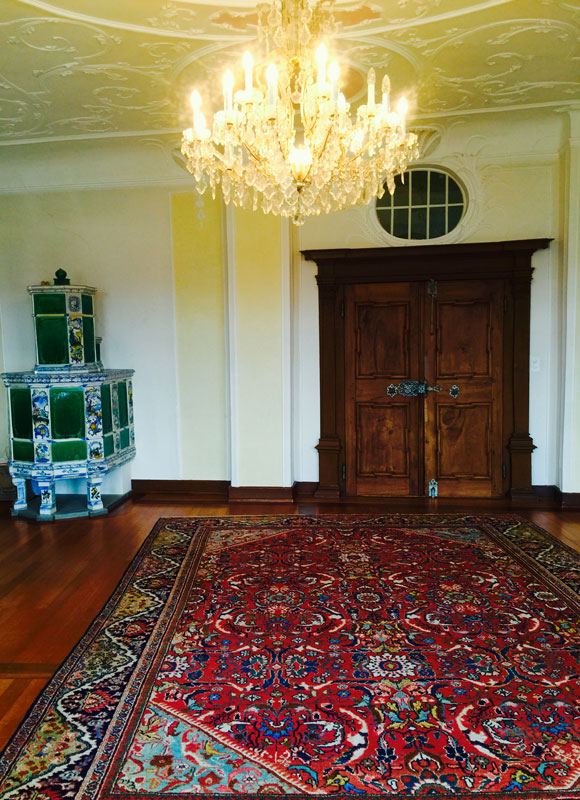 Das Antikzimmer misst 55 m2. Dieser schmucke Raum besticht durch antike Stuckaturen, einem Ofen aus dem 15. Jahrhundert und einem grossen Kristallleuchter.